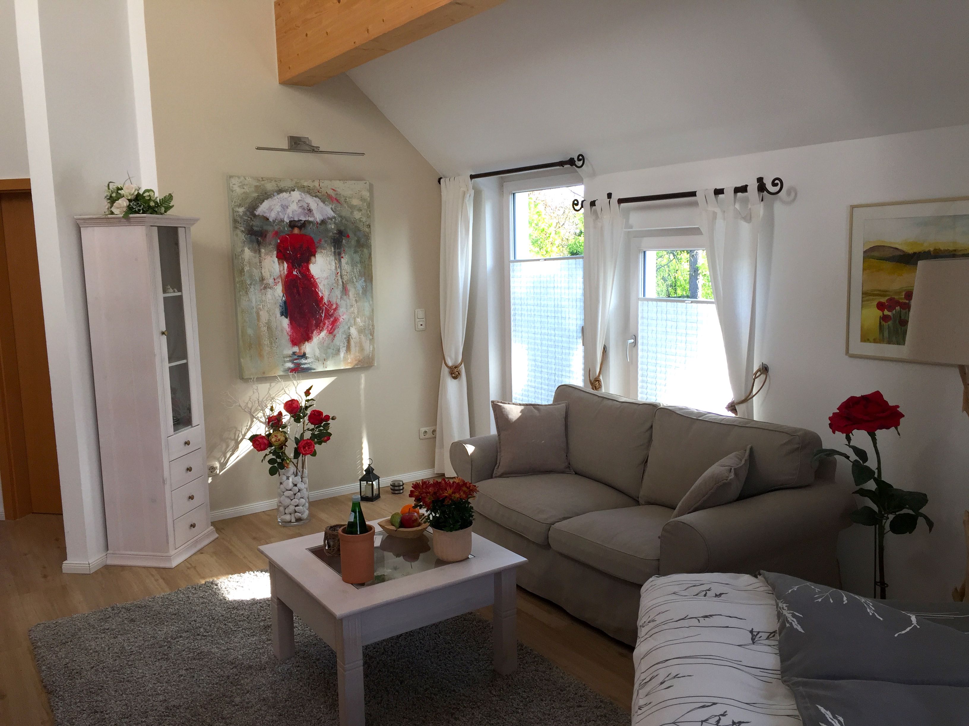 Die großzügige, zauberhafte Suite empfängt Sie mit hellen Farben und aufeinander abgestimmter, geschmackvoller Einrichtung. Landhaus, der Name ist Programm, vom sichtbaren Deckenbalken bis hin zur hochwertigen Bettwäsche. Viele Lichtquellen zaubern abends ein romantisches Ambiente. Über eine Treppe gelangen Sie auf eine kleinere Galerie, welche sich vielfältig nutzen lässt. Genießen Sie den Blick in den Garten von Ihrem großen, privaten Ost-Balkon, der sich für ein sonniges Frühstück geradezu anbietet. Besonders im heißen Sommer ist ab Nachmittag ein schattiger Balkonplatz sehr willkommen. Ein modernes und sehr schönes Duschbad komplettiert Ihre Suite. Frische Blumen, eine Flasche Wasser sowie Obst und kostenfreie Pflegeprodukte haben wir für Sie vorbereitet. Ankommen, zu sich kommen, sich wohlfühlen – probieren Sie es aus.